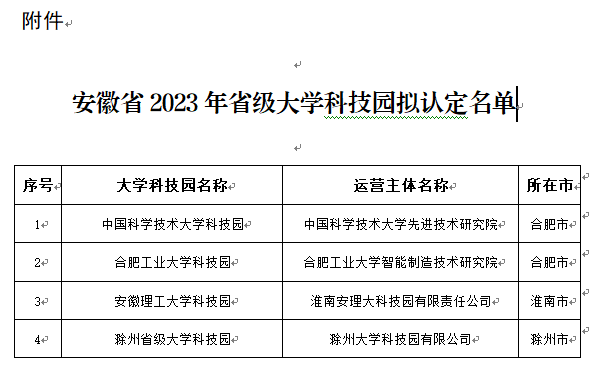 近日,安徽省科技廳網發布公示稱,現對中國科學技術大學科技園等4家拟認定爲省級大學科技園的單位進行公示,公示期爲2023年7月14日—2023年7月18日。